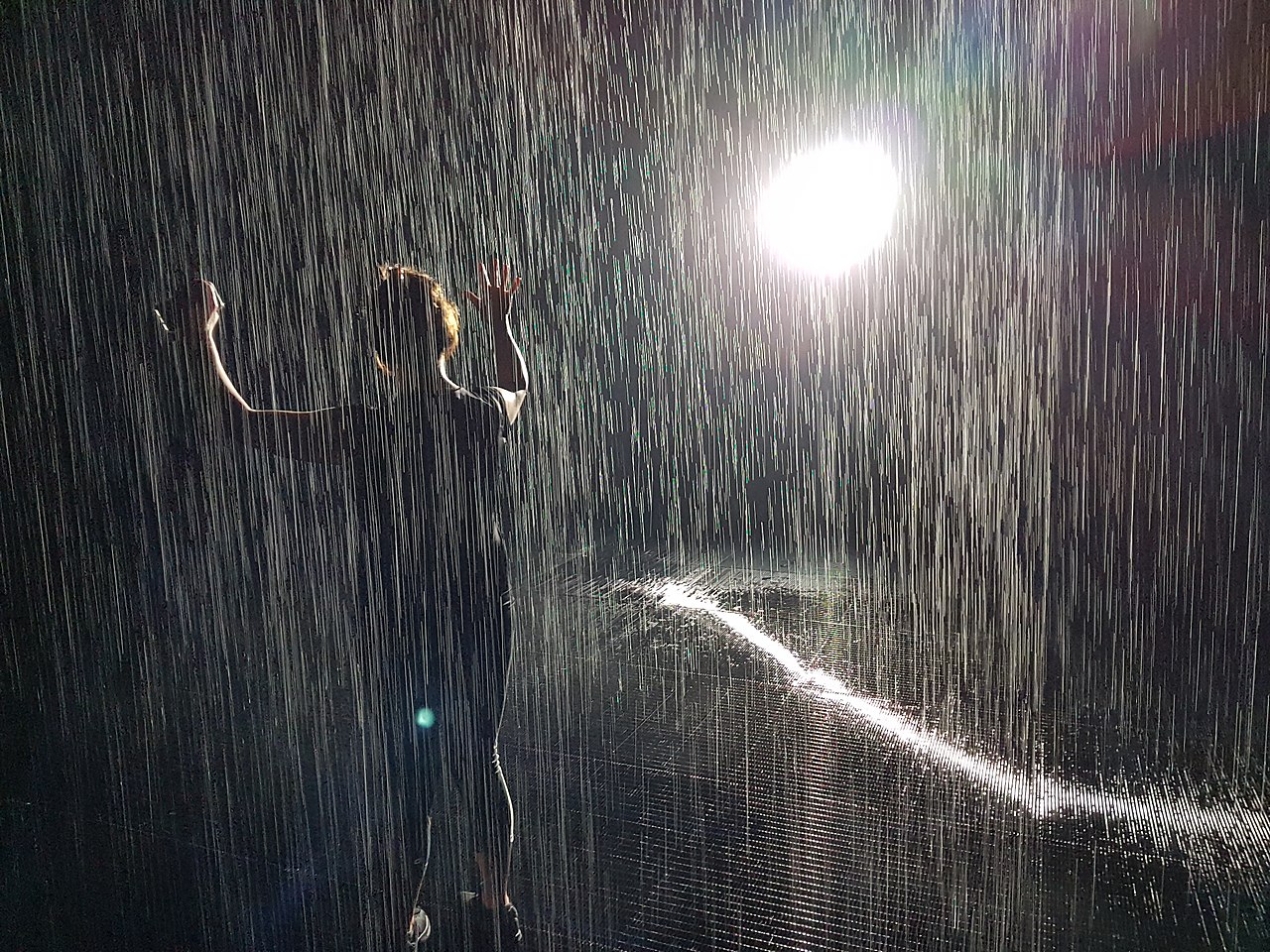 It's a great big underground space, all black, with an enormous rain shower in it - lit by a single lamp. You walk into the rain, hundreds of square feet of it. You walk slowly. Sensors pick up your movement and switch off the rain around you. You walk in the rain, surrounded by the sound of hissing droplets, and you are dry. Unless, of course, you have Naughty Neece Ava with you - who quickly works out how to move in order to game the sensors and get you wet.