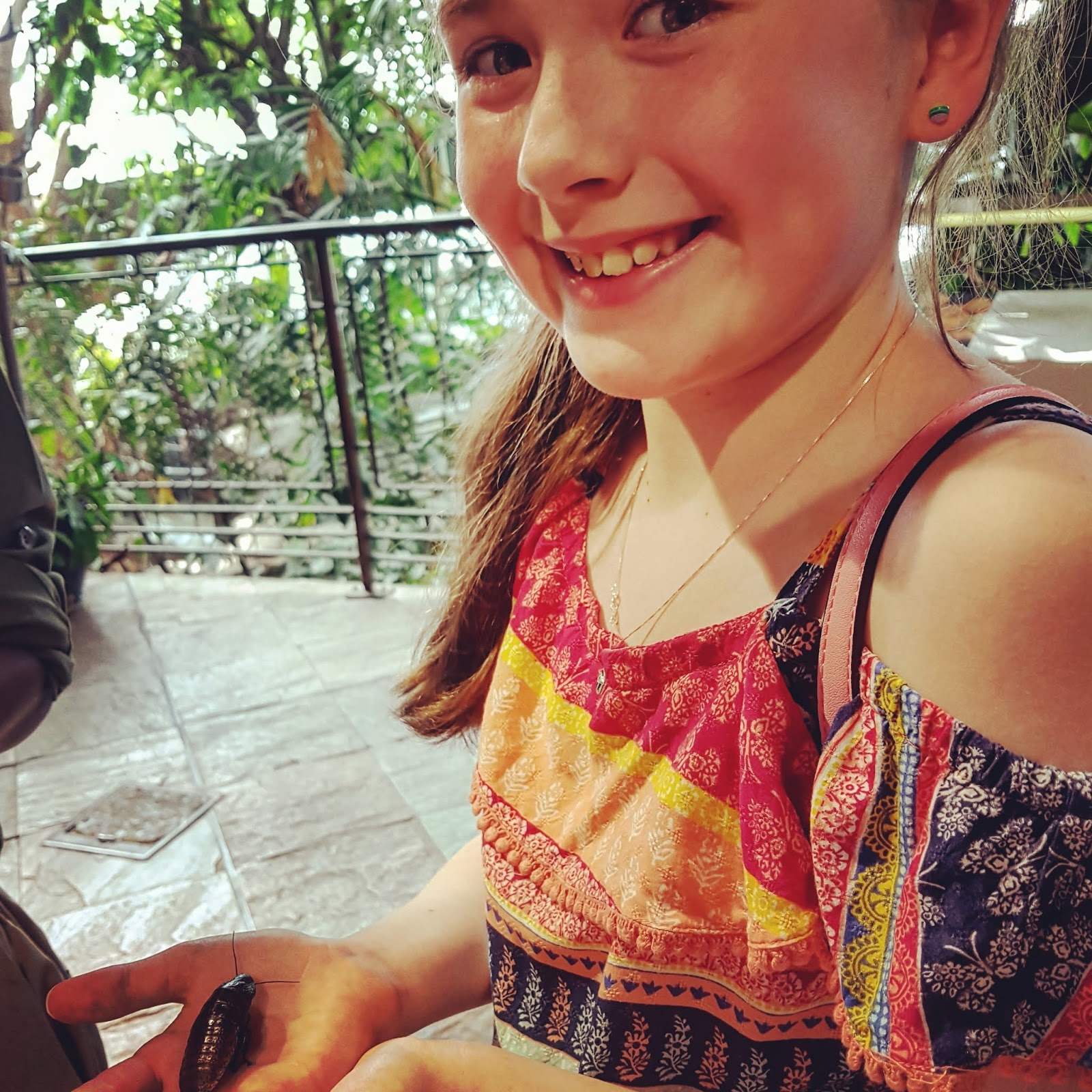Neece holding cockroach at Green Planet. This is the expensive way to do it. For the same experience at zero cost, pop the nearest drain head and scoop your hand in. No, no, please it's nothing. You're welcome...