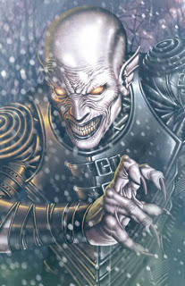 The Strange Man from The Coming Evil TrilogyThis is where our villain, the Maestro, makes his debut. To me, the Maestro has always been a pawn. The Rage is the real enemy. It was difficult writing the Maestro as I wanted to make him very different from the Strange Man (pictured left). Whereas the Strange Man is all about theatrics and delighting in the sound of his own voice, I wanted to make the Maestro completely unimpressed with everything. He's a composer of pain and very serious about his work. Unflappable.