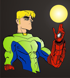 I was in ninth grade when I made Light Sphere. Obviously X-Men was the big thing back in the mid-90s with guys like Cable and Wolverine tearing up the comic book stands. I was too lazy to come up with a proper origin story for Light Sphere back then so he was your typical "mutant"--born with powers. But, I wanted to give him a handicap, so I devised this idea that he couldn't use his awesome powers without these souped-up gloves on his hands, otherwise he'd fry off his flesh. Gnarly, yes, but my 14-year-old self thought it was properly dramatic. I remember writing and tracing...er, drawing...a Light Sphere comic and taking it down to Centerfield, the comic and card shop downtown. I went to that place all the time and used to hang my drawings on their walls in exchange for free bags of sour gummy worms. I showed the proprietors--an older couple--my creation and the lady told me that my idea of giving Light Sphere his limitation was "very original". I beamed with pride, picked up some sugary treats, and set out to finish a second issue where Light Sphere joins the "Governmental Mutant Agency". Oh yeah. Well, me being me, when I wrote the modern version of Light Sphere, I kept all of his stuff the same--even right down to working for the government :p What can I say? I'm a stickler for continuity, no matter how lame it is.