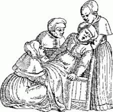 But it wasn't easy to be a midwife. Midwives dealt with births that could go horribly wrong and seldom progressed easily or rapidly. Experiended midwives might administer ergot fungi or make the woman walk about to speed an intransigent birth along. Needless to say, complications, easily handled today, often spelled death for the mother and, possibly the infant.