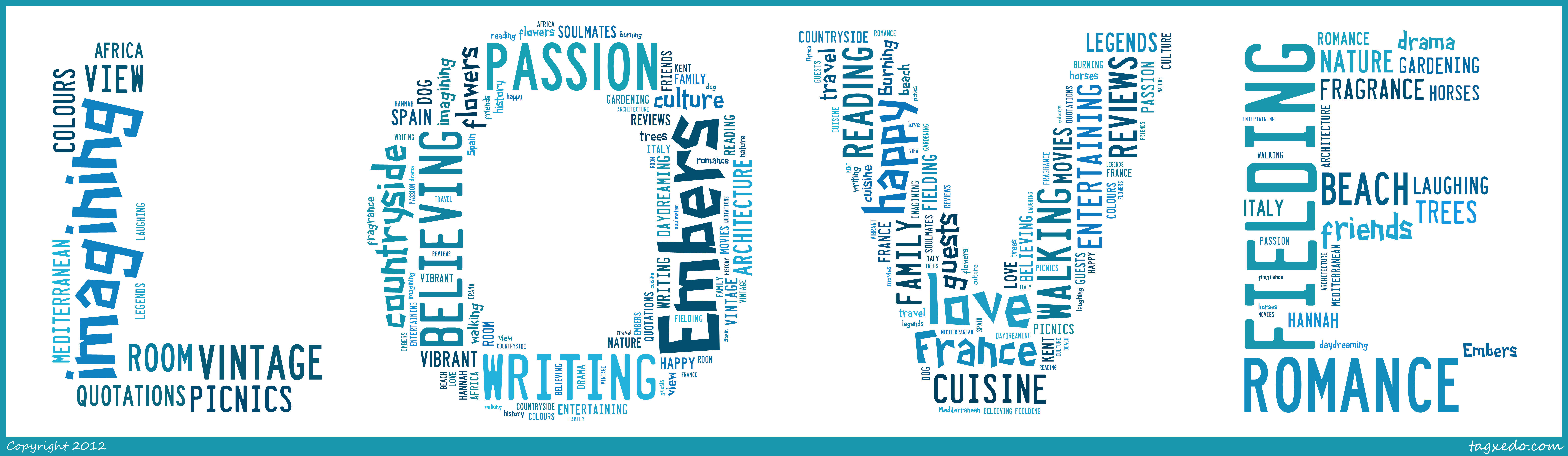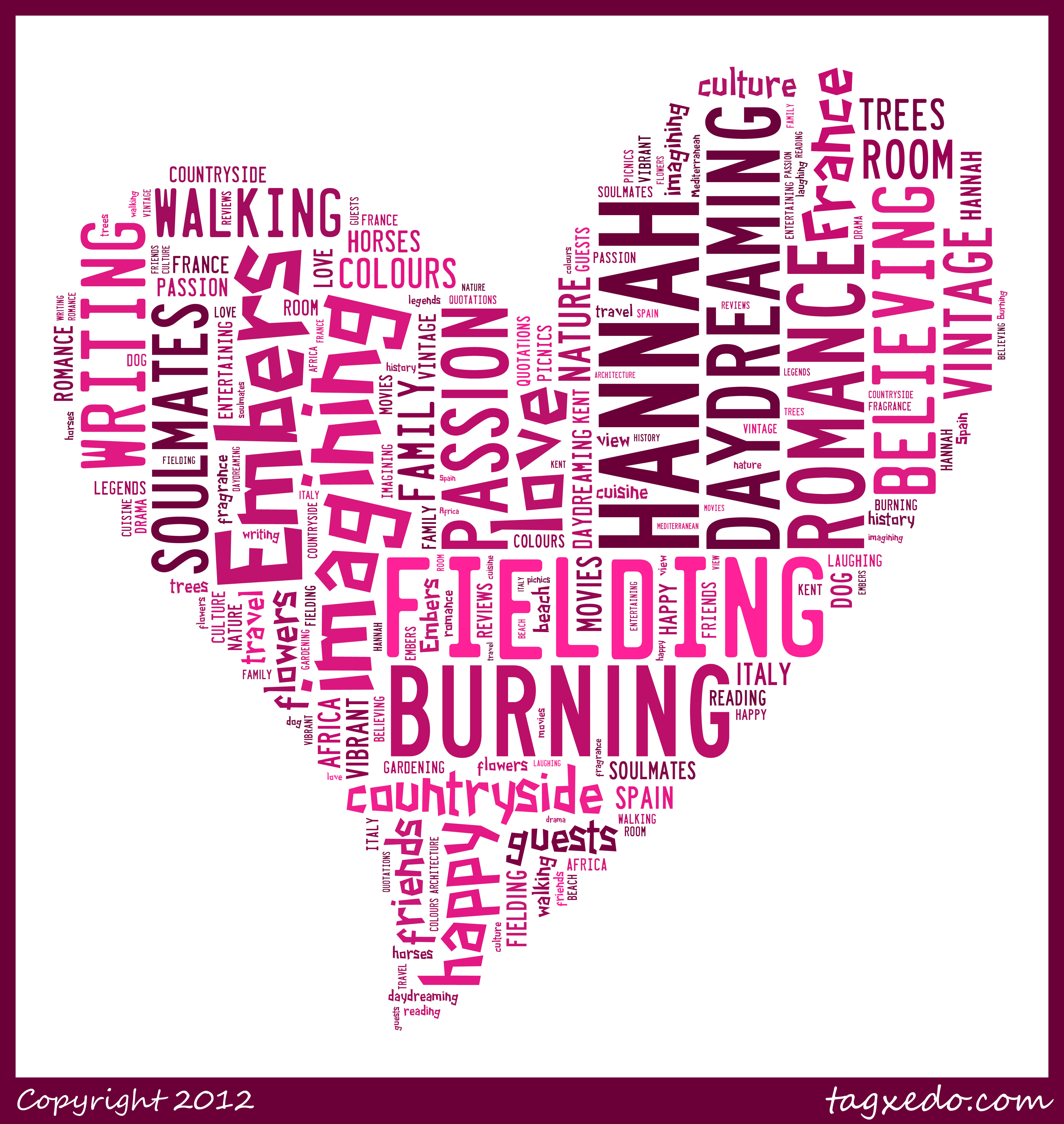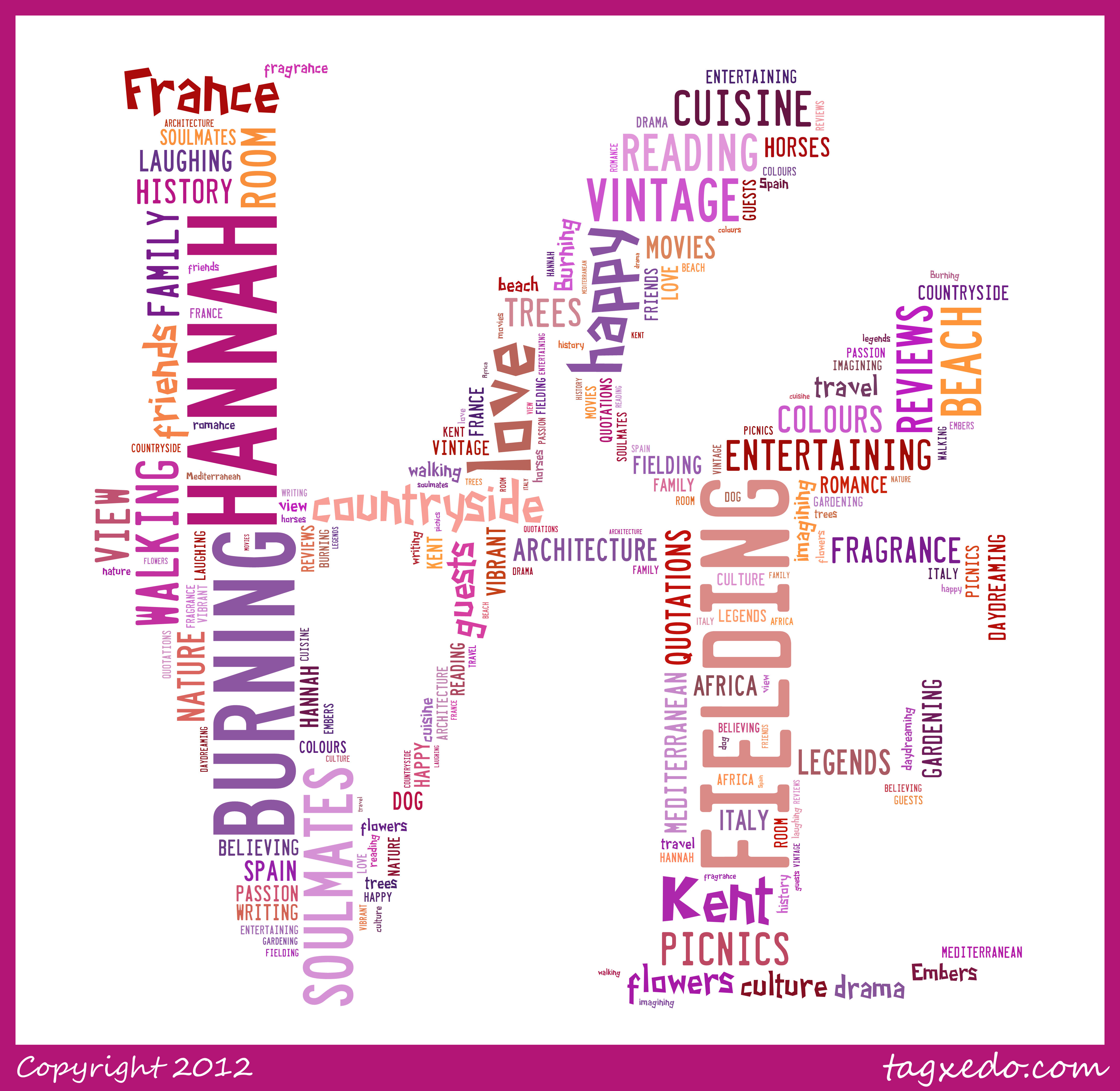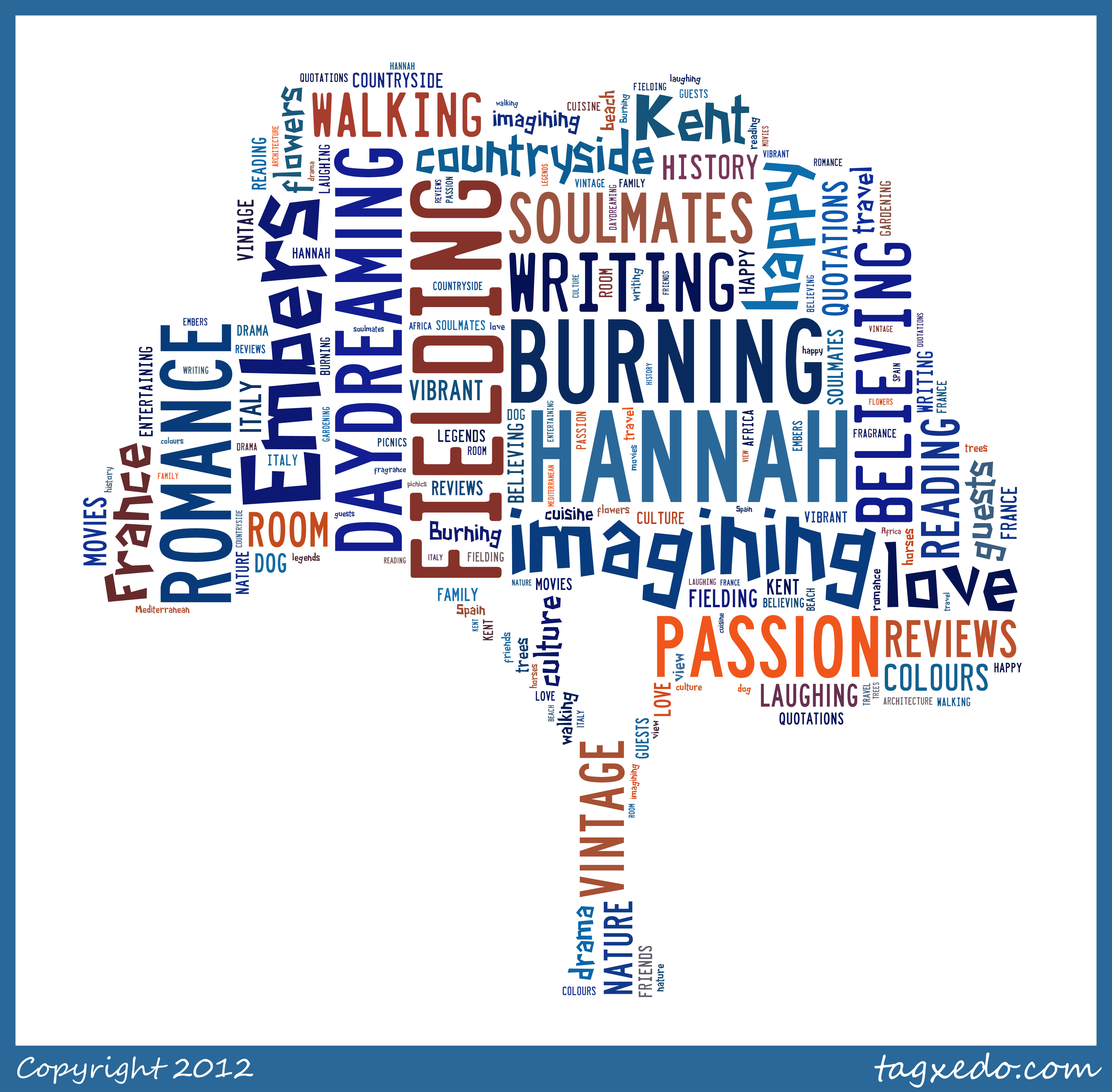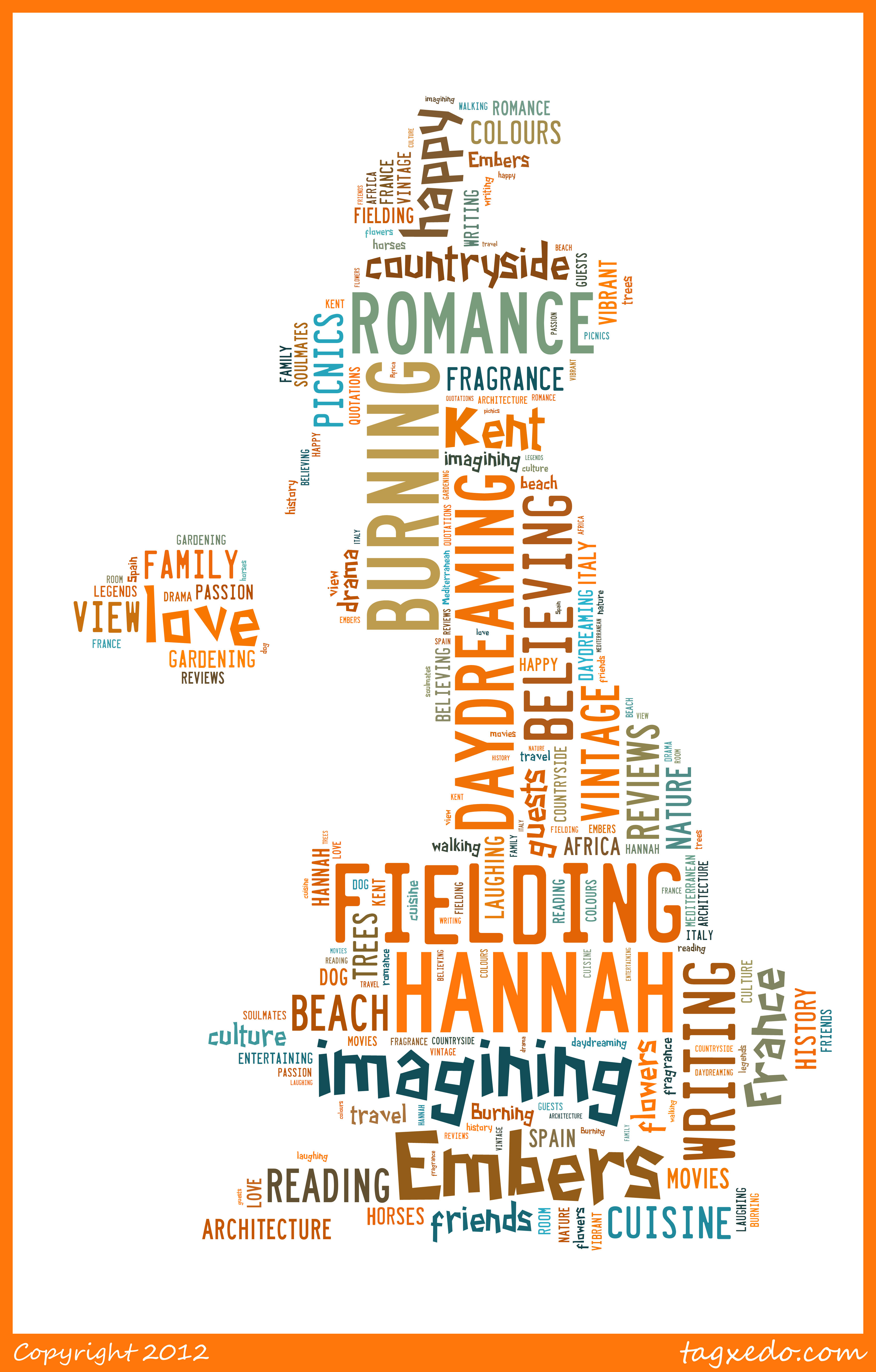 A friend recommended the website Tagxedo to me; oh, what a discovery! Below, you’ll find some ‘Hannah Fielding in a nutshell’ word artworks, created with Tagxedo. If you have a spare moment I highly recommend visiting the site and having a play. You can make word artworks in all kinds of colours and fonts and shapes, save them or publish them to the internet – and even have them printed onto gifts like mugs and t-shirts.