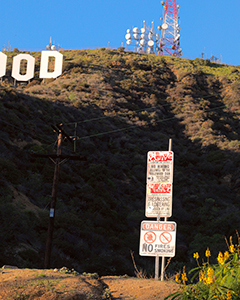 Signs warn the unwary hiker of rattlesnakes and other dangers on the way up to the Hollywood sign. To even get this far, you have to negotiate a complicated route through the Hollywood Hills neighborhood. Klaxons and loudspeakers shriek to frighten you from coming any closer, but the secret truth is, the sign sits on public property, and there isn’t a damn thing the authorities can do to stop you from climbing to the sign.