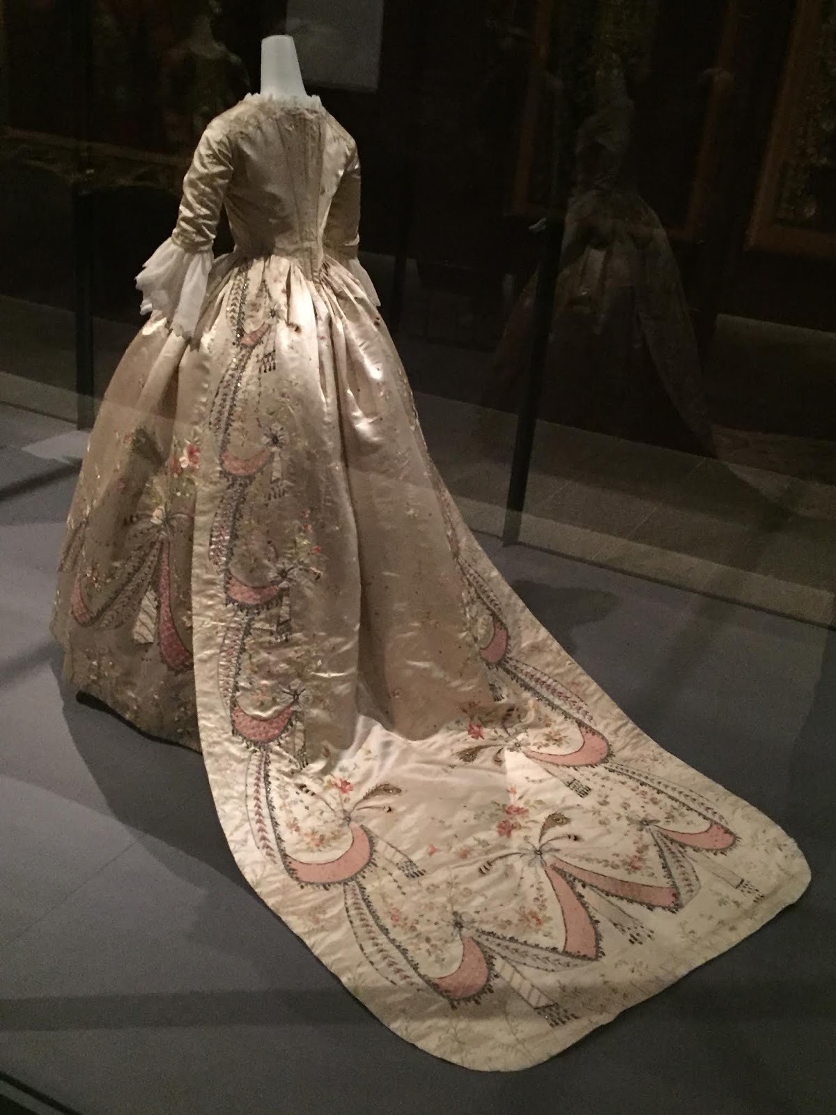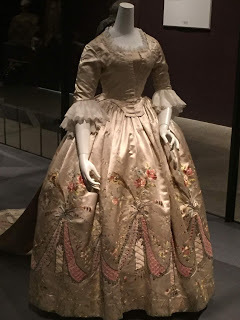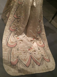 The dress shown here qualifies on every count. It's currently on display through July 29, 2018 at the Metropolitan Museum of Art as part of the Visitors to Versailles: 1682-1789 exhibition (see here , here , and here for my posts featuring other objects from the exhibition.) This exquisite ball gown, or robe parée, would have been worn at only the most formal occasions at the French court at Versailles in the late 18thc.. Once linked to Queen Marie-Antoinette herself, the gown is still attributed to the queen's dressmaker, Marie Jeanne "Rose" Bertin (1747-1813).
