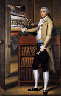 I don't have a portrait of Caroline Boardman Schroeder, but I can't resist sharing the portraits of her parents, Mary Ann Whitman Boardman, right, (with her eldest son William Whiting Boardman) and Elijah Boardman, lower left, both by Ralph Earl. They're two of my favorite portraits from the era; I'm sure that many of the readers of this blog will fondly recognize merchant Elijah's portrait, because he's posed with bolts and bolts of fabric - a dream stash of 18thc textiles.