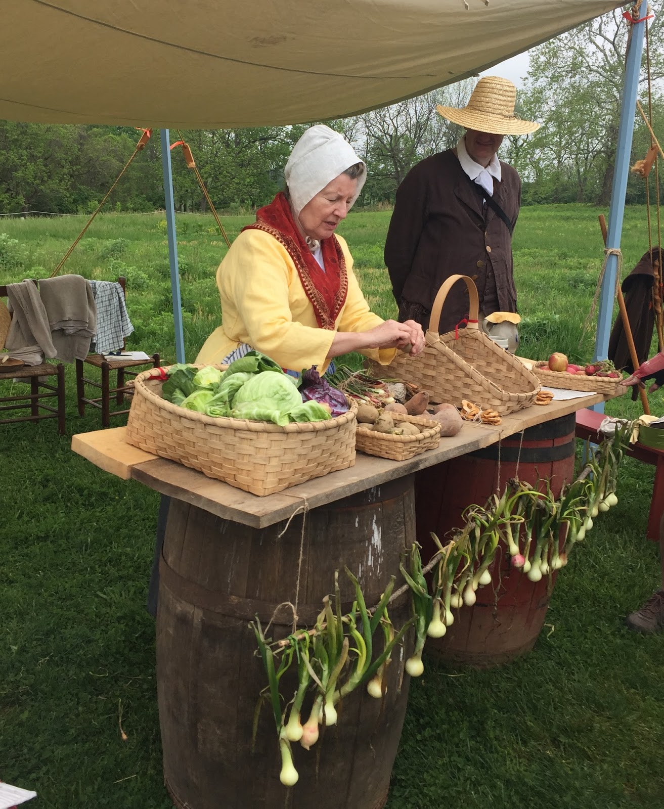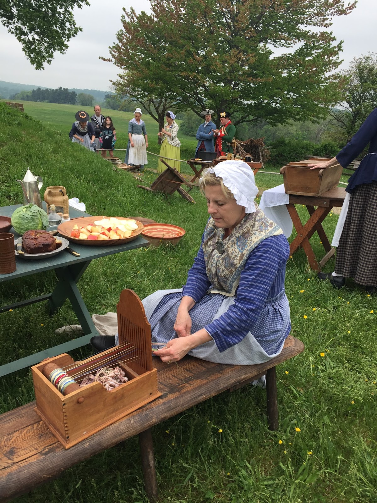 The program at the park showcased many of these women. There were farm women selling the first onions and cabbages of the season, laundresses washing linens, seamstresses stitching shirts, a weaver weaving on a portable tape loom, spies ready to explain secrets and codes, bakers baking bread in a hillside bake oven, and cooks cooking a sausage, onion, and apple stew over an over fire which smelled mighty tasty indeed. There was even an experienced medical woman with a fine display of lancets and scarifiers (I must have missed the leeches) who would have been happy to bleed you to relieve your foul humors.