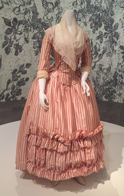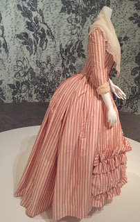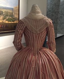 There are two pink striped dresses in the Visitors to Versailles: 1682-1789 exhibition (now at the Metropolitan Museum of Art through July 29, 2018.) Yet while these two dresses are nearly contemporary, together they show the two very different styles in French women's fashion in the 1770s. I've already written about this lavish robe à la Française, a gown from the 1770s that would have been worn to the most formal events at the palace; consider it a wealthy 18thc French lady's "red carpet look."