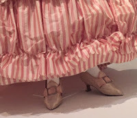 A robe à l'Anglaise like this one would have been worn for day, and the exhibition suggested that it would be perfect for strolling the expansive gardens at Versailles. The shorter skirt would facilitate walking, too, and also show off a stylish pair of heeled silk shoes. A sheer white kerchief of fine muslin or silk would have been tied over the neckline, and an oversized hat or cap and perhaps a parasol would have completed the look. Any of the hats from the painting I shared last week would have been perfect.