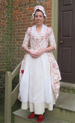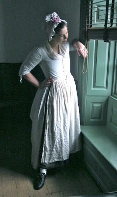 We've seen what a stylish British mantua-maker's apprentice might wear in the shop in the 1770s, what a female blacksmith or other laboring woman might wear at her work, and, what, too, a housewife might wear as she went about her day. Now Abby Cox, one of our knowledgable friends from Colonial Williamsburg , shows us what a woman in domestic service might wear. (Her clothes are modern replicas, not 18th c originals, but cut and sewn entirely by hand in true 18th c fashion.)