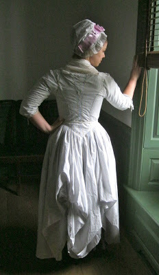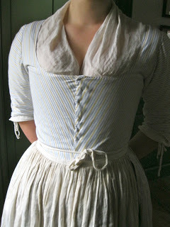 Here Abby is wearing an untrimmed English-style gown of a woven striped cotton. The gown has inverted back pleats to shape the waist, and is worn over a plain dark linen petticoat (the under-skirt) and a white linen apron. She has looped her skirts up both to help keep them clean, and to mimic the elaborate skirts of more fashionable gowns - though the effect in the soft cotton fabric lacks the exuberance of poufs of crisp, costly silk.