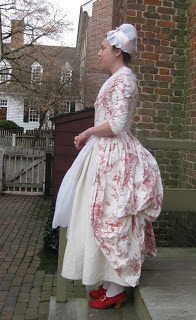All of which is why I especially enjoy seeing what our mantua-maker friends in the Margaret Hunter Shop, Colonial Williamsburg , are wearing to work. While they might be stitching fine silk, for the most part they're dressed as their 18th c. counterparts would have dressed. A shopkeeper's assistant or apprentice in the fashion trades was expected to dress as stylishly as possible within her means, and their clothes often reflected the latest fashions sewn in more modest fabrics. Stylish was good for trade - she was, after all, a walking advertisement for the shop - but not so stylish that she rivaled the customers by dressing above her station. (As always, please click on the photos to enlarge to see details.)