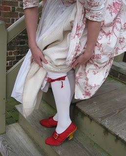 While the gown has no costly silk ribbons or trimmings, the apprentice's fine linen cap features not only a wide silk bow, but also extravagant pleating for maximum effect. Her kerchief and apron are also fine white linen, and her white thread stockings and quilted petticoat also contributes to the impression of a neat and tidy assistant. I like the subtlety in the white-on-white textures; if you look closely, you'll see that there's a woven check in her neck kerchief, and diamond-patterned quilting in her petticoat. There's another spot of color in the heart-shaped red pincushion - an essential part of the trade - that hangs ready at her waist, and more in her red ribbon garters. Everything except the stockings was cut and stitched by hand by Sarah herself, just as any good apprentice should.