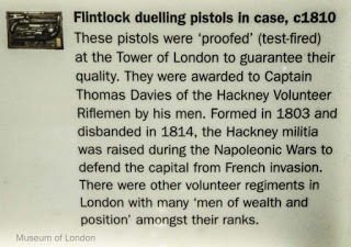 The elaborately fitted-out case from the Museum of London features a pair of Flintlock Dueling Pistols of about 1810. (By the time of my story, the men would be using percussion lock pistols. However, the conversion didn’t demand a whole redesign of the pistol. Many flintlocks were easily converted to percussion, as you will discover if you click on the links above.)