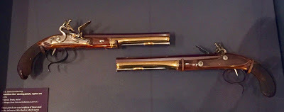 Have I seen the original pistols? No; I haven't the heart (but you, who are of sterner stuff, can see a photo of them here ). Seeing the replicas and realizing exactly how large the ball must have been to fit those barrels - and imagining the damage such a ball would cause - was enough for me.