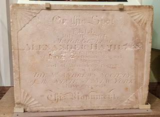 Within a year of Hamilton's death, a marble monument in his honor had been placed at the site of the duel at Weekhawken, left. Before long, souvenir-seekers had chipped away so many pieces of the marble that the monument was finally taken down around 1820, and later in the century the original dueling grounds were obliterated by railroad construction. Only the pitted marble plaque from the monument's base, lower right, now remains in the New-York Historical Society. Today the duel is commemorated in Weekhawken with a small park at the top of the Palisades overlooking the original site. The park includes a bust statue of Hamilton, the stone where he was traditionally believed to have rested against after being wounded, and a stunning view of the Manhattan skyline. It's become such a popular site for visitors that it now has it has a page on TripAdvisor .