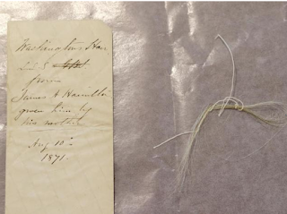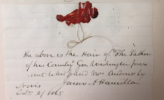 A Google search by Phillip Wajda, Union's director of media and public relations brought him to my blog pos t about historic hair in the collection of the Massachusetts Historical Society. (See the strands of Washington's hair, held together with red wax, that belong to MHS, lower right.) The handwriting accompanying that hair does appear to the be same as is on the envelope, belonging to James Alexander Hamilton (1788-1878.) James was the fourth child of Elizabeth and Alexander Hamilton, and, like his mother, was very aware of both his father's legacy and his family's place in American history.