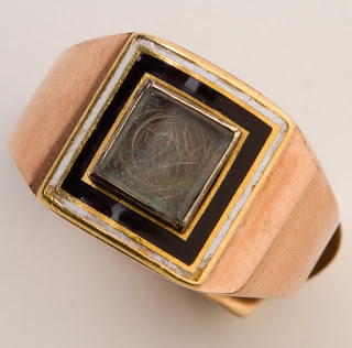 I haven't seen the ring, bottom, in person, but spotted it on an online auction house site. This ring, also gold, features the precious hairs loosely wound together beneath a bevelled crystal, and surrounded by bands of white and black enamel. According to the description, the ring was worn as a pendant, suspended on a ribbon through the gold link added to the ring. The ring was said to have descended directly through the Hamilton-Schuyler family, and is believed to have been worn either by Eliza herself, or one of her daughters.