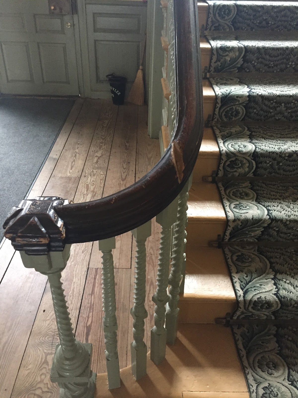 Left: Photograph of the Schuyler Mansion staircase, ©2017 Susan Holloway Scott.