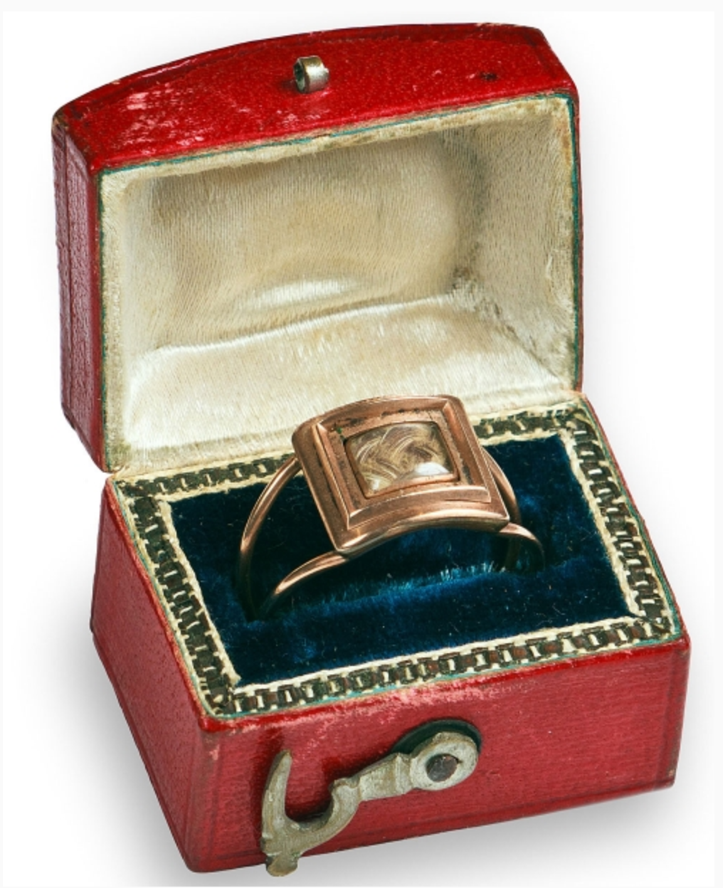 Above: Gold mourning ring, containing the braided hair of Gen. Alexander Hamilton, presented to a friend of Hamiltons by his wife in 1805. New-York Historical Society.