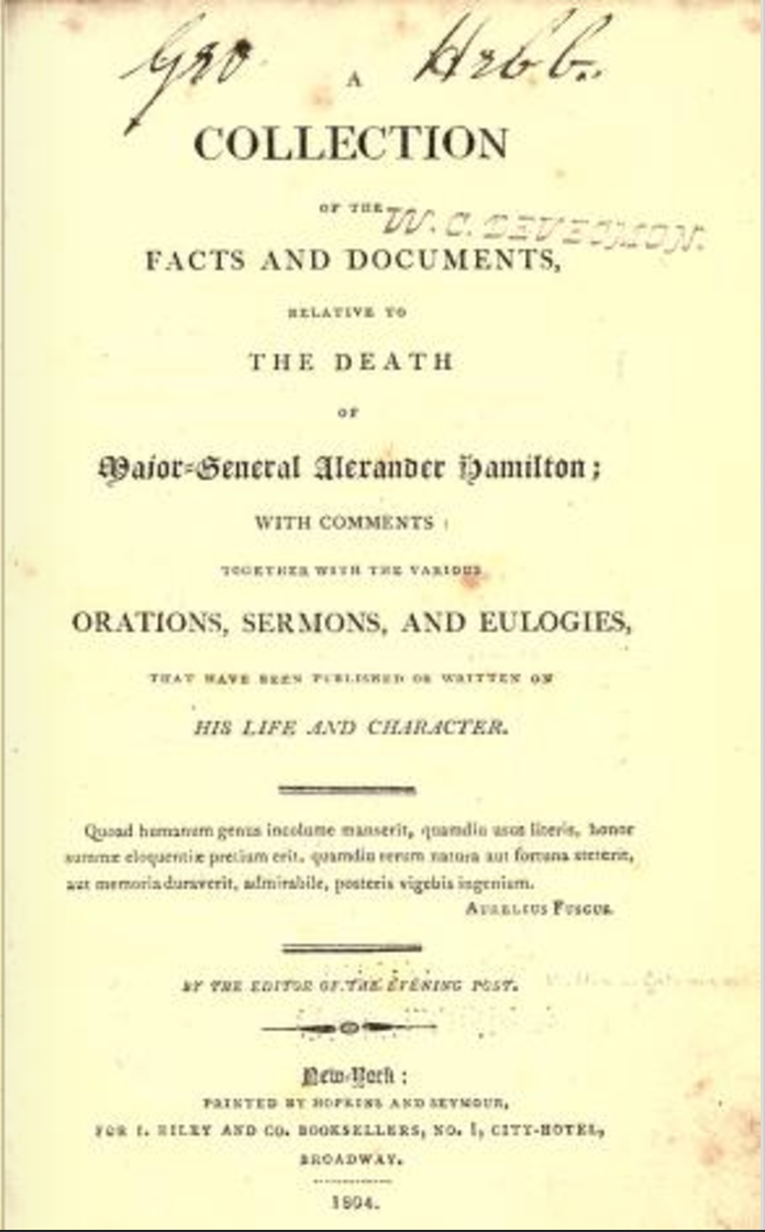 Below: Title page, A Collection of the Facts and Documents, Relative to the Death of Major-General Alexander Hamilton.... New York: Printed by Hopkins & Seymour for I. Riley & Co, 1804. Collection, University of California Libraries.
