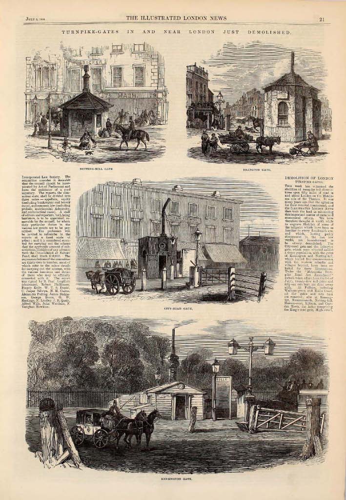 This week has witnessed the abolition of turnpike toll obstructions upon fifty miles of road in and about London on the Middlesex side of the Thames. It was many years ago that the agitation for air removal commenced, and the Illustrated London News then took the lead in advocating this important matter of social and economical reform. We have therefore thought it worth while to engrave Sketches of some of the tollgates which have been so familiar to every Londoner's eye. and which, having partly disappeared in the last few weeks, are henceforward to be utterly demolished. The City-road gate and the Islington gate, which were situated amidst a dense population, with the gates of Kensington and Notting-hill, which barred free communication with the western suburbs and villages beyond, have been selected for these Illustrations. Under the “Metropolis Turnpike. Road Act Amendment" (which takes effect from the 1st of July), twenty-five toll-gates and fifty-six side bars are done away with. At Fulham. including Walham-green and Earl's Court, all the gates and side bans are removed; also at Kensington, Hammersmith, Notting-hill, Harrow-road, Kilburn, and Camden Town, the latter comprising the King's-road gate, High-street, Chalk Farm, and the Brecknock gate, as well as the gate in the road at Kentish Town. Further removals take place at Holloway, Islington, Ball’s Pond, Kingsland-road, Cambridge-heath, Hackney, Twickenham, and Teddington. All the gates and side bars of the city-road are included. We congratulate the whole metropolis upon the abatement of this nuisance, and hope soon to record its total extirpation on the Surrey as well as the Middlesex side of the river.—The Illustrated London News, 2 July 1864