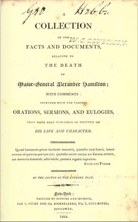 Published not long after Alexander Hamilton died from wounds incurred in his infamous duel with Aaron Burr in July, 1804, the book is exactly what that title says it is. Today's publishers often rush such titles to press to cash in on a topical event, usually branding them as "special souvenir collector's editions" and the like, but in 1804, this was unusual. Then again, the circumstances were unusual, too. The country - and particularly Hamilton's hometown of New York City - were stunned by news of a duel between the former Secretary of the Treasury and the current Vice President, and shocked by Hamilton's subsequent death.