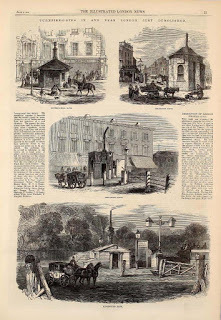 During my visit to the London Transport Museum , some clippings from the Illustrated London News gave me another little surprise: Hyde Park Corner Toll-gate might have gone away in the 1820s, but the majority of turnpike gates stayed in place for a long time afterward, in spite of decades of complaints, until the 1860s.
