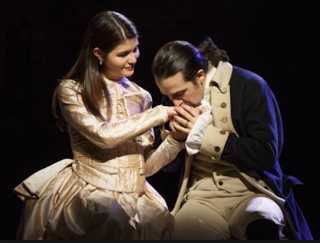 While there are no records or contemporary descriptions of how Eliza Hamilton dressed during her pregnancies, I imagine that she, too, wore adaptable garments such as these, and that's how I described them in I, Eliza Hamilton. I suspect I'm not the only one inspired by this ensemble, either. The costume that's worn by the pregnant Eliza (played by Philippa Soo, and shown bottom left with Lin-Manuel Miranda as Alexander) in the musical Hamilton looks so much like the Colonial Williamsburg ensemble that I have to think the show's designer Paul Tazewell was aware of it, too.