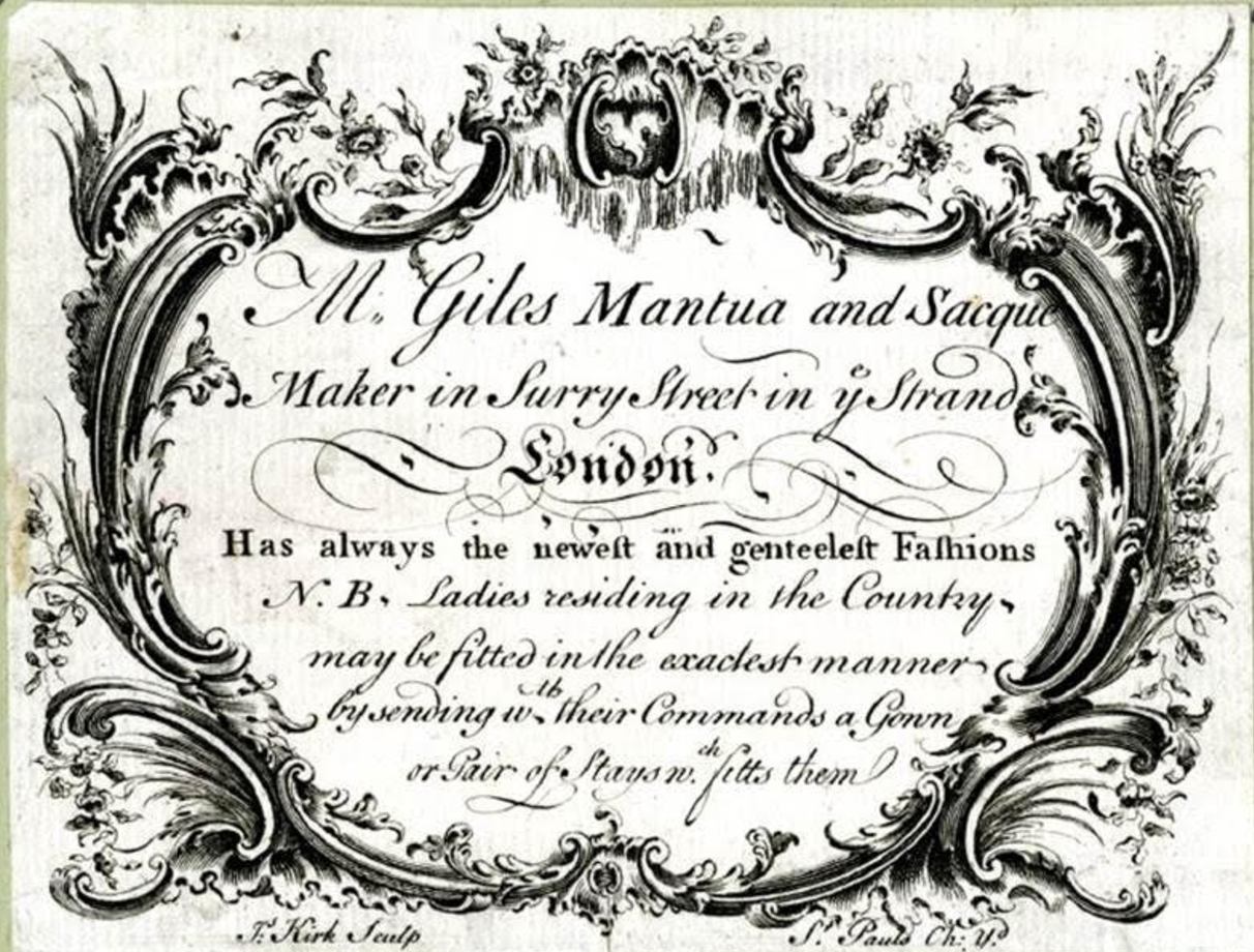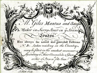 The trade card, bottom right, for London mantua-maker M. Giles offers the same services for "Ladies residing in the Country [who] may be fitted in the exactest manner by sending with their Commands a Gown or Pair of Stays which fitts them."