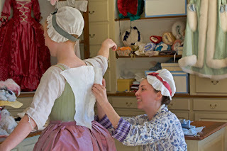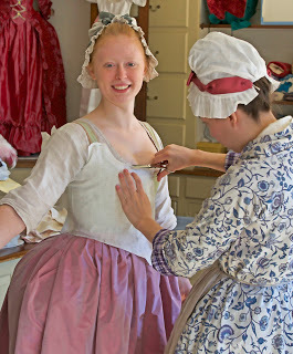 In these photographs, Sarah is shown fitting the plain linen lining for a polonaise jacket and matching petticoat on Aislinn Lewis, one of the blacksmiths at Colonial Williamsburg. This ensemble was one of Sarah's final apprenticeship projects completed to prover her skill and move up as a journey-woman. Sarah only required Aislinn for a fitting in the morning to cut the lining, and another in the afternoon for a sleeve fitting. That was all; Sarah was able to hand-sew and complete both pieces - made from pink changeable silk - in about thirty-six hours, including all the trimmings.