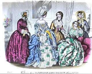 To compare and contrast actual dresses with prints, you might want to look at some early 1850s fashions at the Metropolitan Museum of Art’s online costume collection here , here , and here .