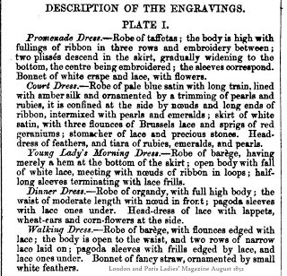 Last year, in my 1850s fashion post , I lamented the dearth of complete magazines, with fashion plates, online for the Victorian era. It seemed that Godey’s was about all there was, with one or two Petersons. Since then, I’ve found a nice collection of the London and Paris Ladies’ Magazine of Fashion on Google Books. The magazine is rich in fashion prints. For August 1852, I chose Plate 1 because it shows a court dress, which tends to be quite a different fashion species from other clothing, even evening dress. While the plumes tend to give it away, court dress also stands out in prints like these because it’s so elaborate. This one is clearly so, dripping with jewels.