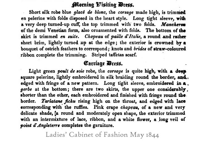 Of the 1830s, Cunnington’s English Women’s Clothing in the Nineteenth Century has this to say: “The fashions of this decade illustrate the transformation from a phase exuberantly romantic into one droopingly sentimental. The change occurred abruptly in the middle of 1836.”
