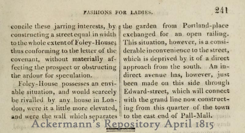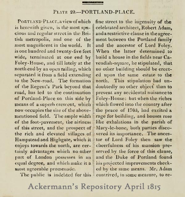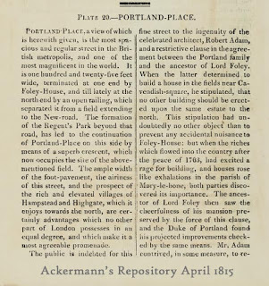 Not until I read this entry about Portland Place did I know there was such a building as Foley House, or the rules that once existed about building in the vicinity. Not surprising. So many great London houses have disappeared, some with virtually no trace. However, I did manage to find an old engraving online (please scroll down), from Old and New London, one of my oft-consulted Victorian guidebooks to London’s history (complete, apparently, with various Victorian myths).