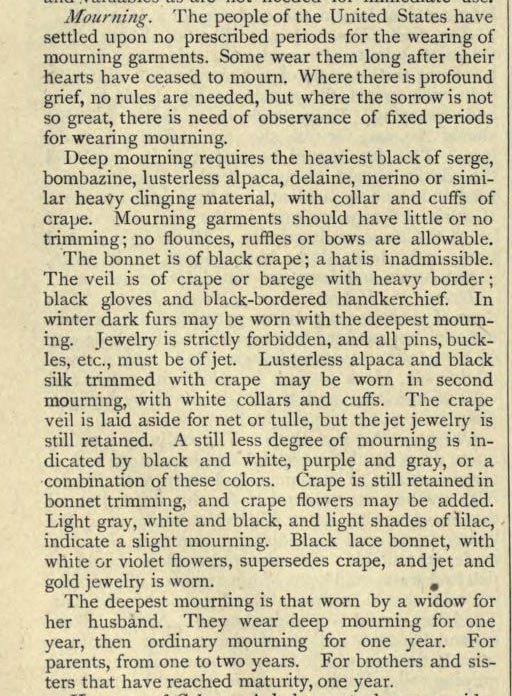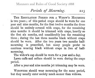 Obviously, things changed from Scarlett O’Hara’s time. The clipping from American Encyclopedia of Practical Knowledge 1886 tells us there aren’t any hard and fast rules, while the one from Manners and Rules of Good Society (England 1888) is quite specific. My own copy of Manners and Rules of Good Society for 1911 shows a loosening of the late Victorian rules, but things still aren’t as casual as in the U.S., and one can imagine some of the older generation frowning at younger widows who shorten their mourning period to less than 18 months.