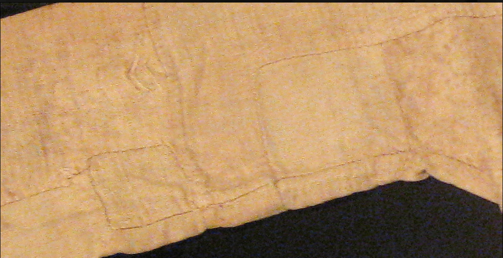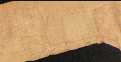 This shortgown has been patched, and patched again, with neatly squared patches and careful stitching. As you can see in the detail, right, some of the patches are scraps of the original fabric, and others are simply similar fabric. Most of the patches are in places that would have received the most stress and wear, under the arm and along the sleeves.