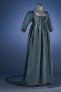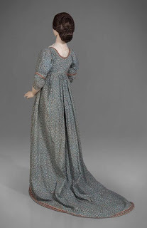 The dress is also proof that not every woman in early 19thc Britain - an era much-beloved for the costumes shown in many Jane Austen-inspired films - dressed in plain white cotton muslin. Prints and color were available for ladies who wished to stand out from the crowd, and those who understood the practicality of a dark print and its ability to mask a bit of dirt between laundering.