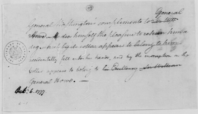 I won't ruin the spot with spoilers, but what's shown really did happen. The draft of the note, below, now in the Library of Congress, was written to accompany the dog. The message is from the commander-in-chief of the Continental Army, General George Washington, writing to the commander of the British Army, General William Howe. Washington was himself a great dog lover (there's an entire page on the Mount Vernon website devoted to his dogs), and did in fact return his enemy's lost pet, one gentleman to another. As was his practice, Washington dictated the note to a aide-de-camp. In this case, the aide was a young lieutenant colonel named Alexander Hamilton, who, despite his unquestionable devotion to the American cause, was still sufficiently dazzled by Howe's title that he first addressed him as "Sir William" instead of "General."
