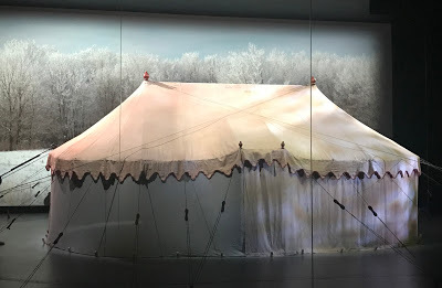 Still, the delicate fabric can only withstand very limited exposure to light and other environmental elements, and the tent is carefully maintained in a 300-square-foot, climate-controlled display case. Faced with these limitations, the museum's multi-media presentation of the tent is an engaging and emotional experience. Long-time readers of this blog will recall the replica of the tent and its accoutrements hand-made at Colonial Williamsburg ; that tent acted as a "stunt double" for the real tent in the accompanying film.