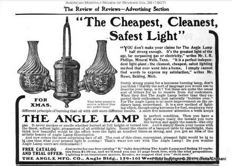 But what caught my Nerdy History Girl attention was the lamp in the restored living room. A guide told me it’s an Angle Lamp, and showed me an old advertisement for it. Turns out this was a well-known type of kerosene lamp, which was around for quite a long time, and whose advertisements appeared in numerous periodicals.