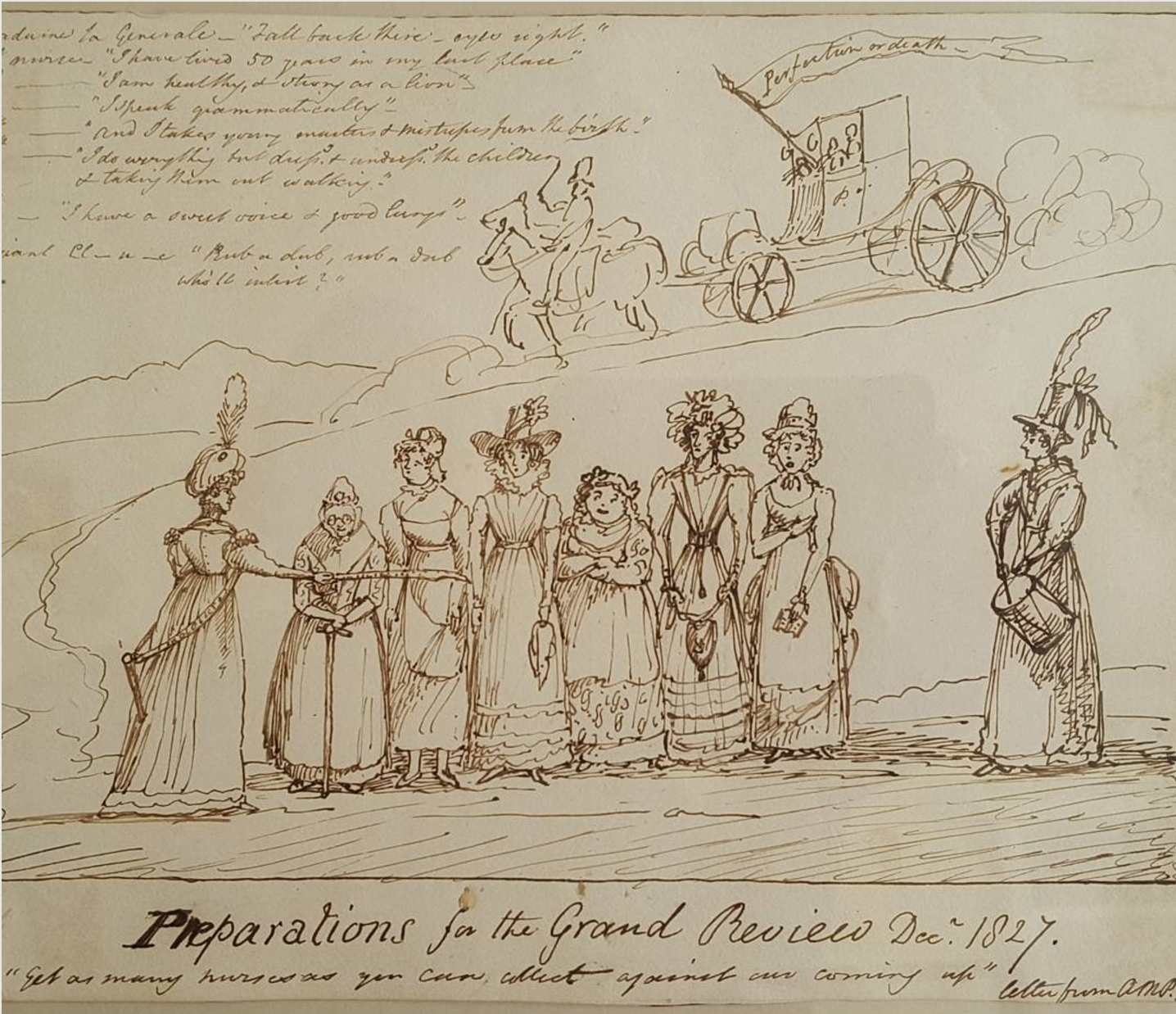 The illustration is entitled Preparations for the Grand Review December 1827. Patrick describes it as a "piece of family satire. Drawn as a result of a letter from my 3rd great-grandmother, Anne Margaret Polhill (née Graham) from Hove to the housekeeper at their London house. 'Get as many nurses as you can collect against our coming up' [was the order.] As Madame la Générale, she orders: 'Fall back there - eyes right.'"