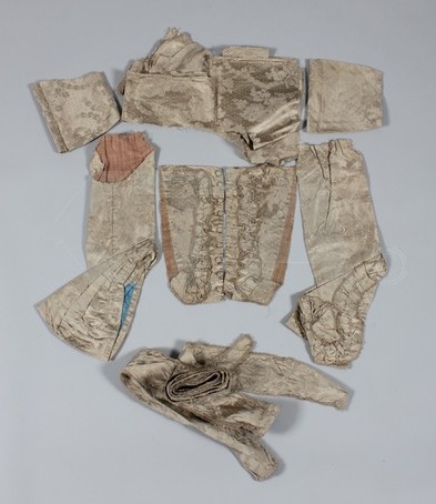 In the middle of the photograph is the original gown's compere stomacher, a kind of false-front with buttons like this (from one of our new Pinterest boards .) Lying on either side are the original elbow-length sleeves - too narrow to have been remodeled - with their gathered, serpentine trim ( like this ) on the outside of the flaring cuffs ( like this .) Without examining the pieces, it's difficult to guess the rest of the 18th c gown, but I'm sure that with the pieces spread out like a jigsaw puzzle, a costume historian could do exactly that.