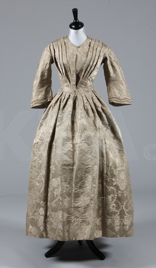Above & lower left: Mid-19th c dress, made of 18th c silk damask. Photographs courtesy of Kerry Taylor Auctions.