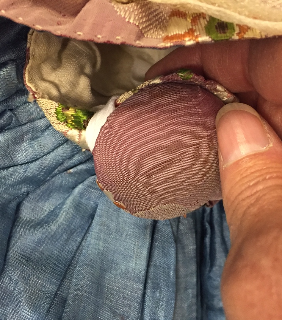 I also liked how the sleeve flounces were lined with a contrasting plain-weave blue silk. The flounces had an extra little secret, too, bottom right. Sewn inside each flounce was a flat, oval-shaped, lead weight, covered in fabric, that made the flounce hang correctly from the wearer's arms. Like all the most sumptuous 18thc clothing, it's the little luxurious details - everything stitched or otherwise created by hand - that are so special.