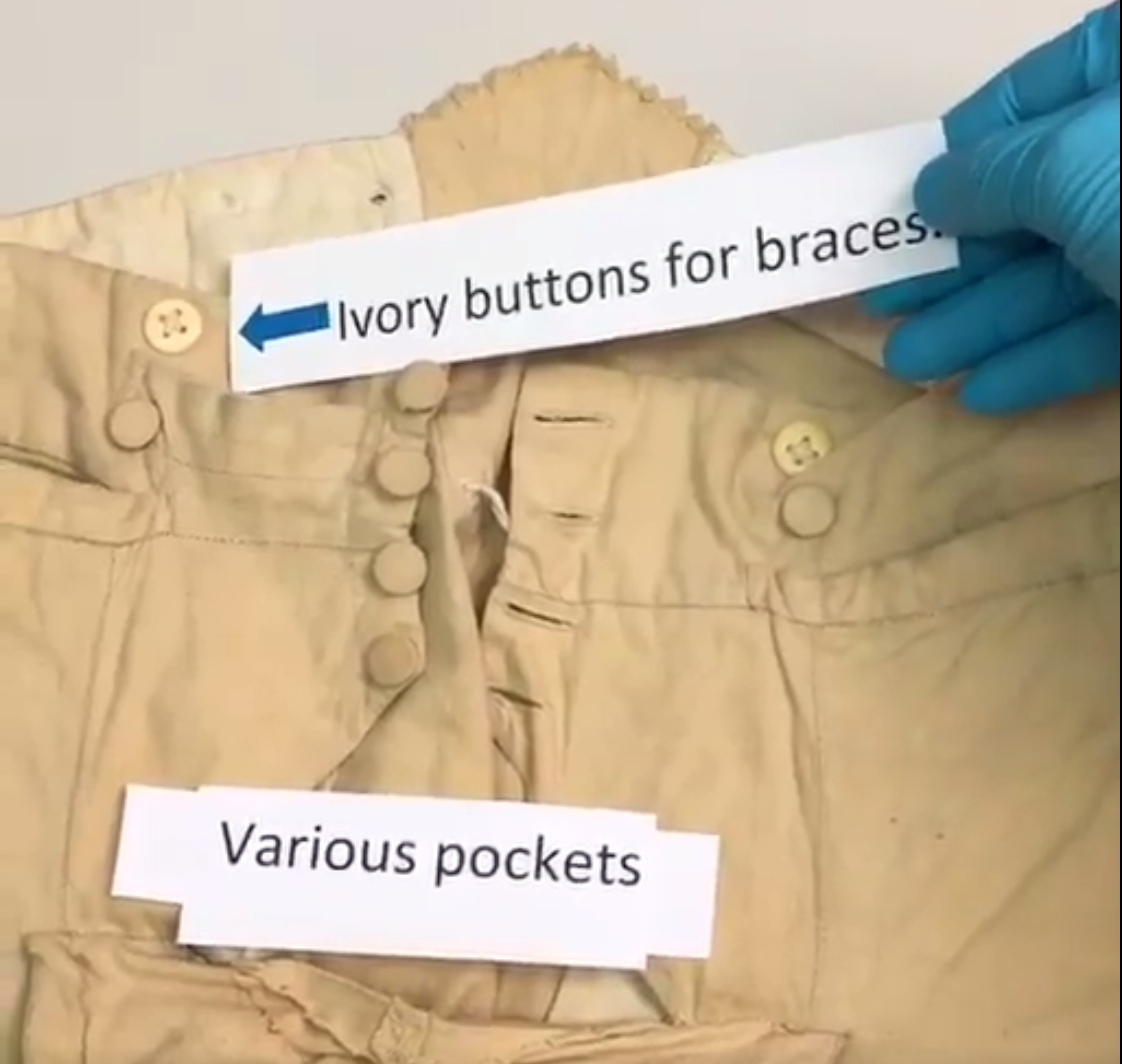 • The finer details of a pair of super-skinny men's trousers , c1810, above, including a close look at how the seams split and were mended.