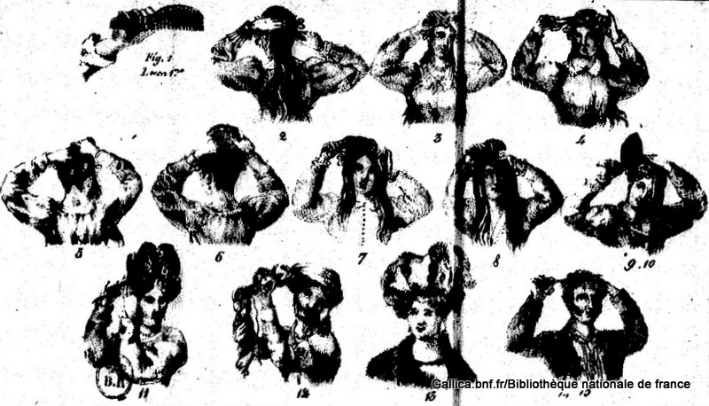 Since the instructions quoted in The Lady’s Stratagem are lengthy, I can only refer you to that book for the details on creating this style—or, if your French is better than mine, you can follow the directions in Arte de se coiffer soi-même, enseigné aux dames (1828) ( here or here ).