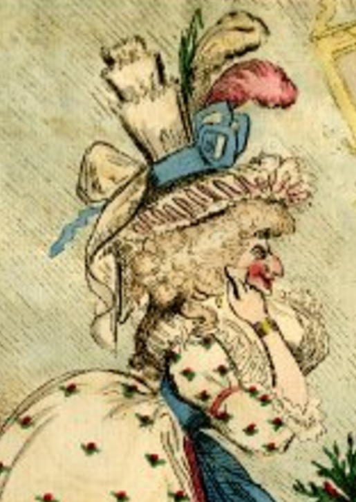 To the right sits one woman ostentatiously retying her garter, perhaps a potential customer for Dr. Leake, while another is freshening her makeup at a looking glass. This tall woman, detail right, is believed to be Lady Sarah Archer, an aristocratic widow famous for her independence, her love of gambling, and her interest in politics and outdoor sports (she drove her own phaeton and rode to the hounds.) In the eyes of misogynistic 18thc caricaturists, however, her greatest sin was being over forty with a fondness for makeup and fashion. She is always cruelly drawn with florid cheeks and an exaggerated hooked nose to accentuate her supposedly unfeminine appearance - and what better way to mock her further than to show her painting her face in a communal outhouse?