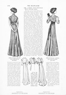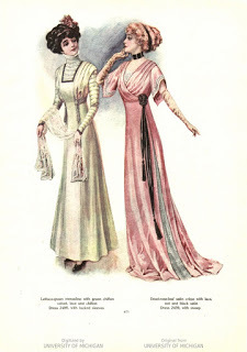 Between 1907 and 1908 fashion underwent a major change in terms of silhouette. If you compare this plate to the one posted at left, the difference is obvious. The top-heavy S-curve has smoothed out, and a more vertical look—which may remind you a bit of the Regency style—has taken over.