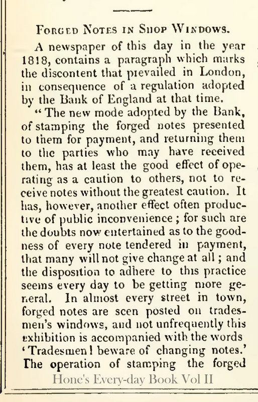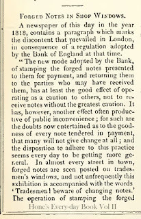 In researching Dukes Prefer Blondes , I spent some time looking up criminal cases. I was struck by the number of prosecutions for coining and forgery. That was why the short entry (shown below) in Hone’s Every-day Book about forged notes caught my attention.