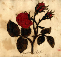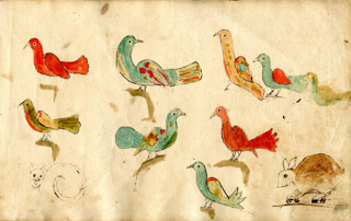But later in the book, Ann also drew from her life: pictures of Philadelphia women, middle right, detailing their dress, and a view of a house that may have been her own. (I particularly liked the thin black ribbons worn around the throat of one of the women that, according to Ms. Isaac, were a worldly fashion embraced by young Quaker women around 1760, and deplored by their elders - exactly the kind of thing that a teen-aged artist would note.) Fragments of faces in faded pencil peer from the pages, and more realistic drawings of flowers and birds were likely copied from botanical prints. Although untutored and unsophisticated, there's an undeniable energy to her drawings, and a quick eye for detail.